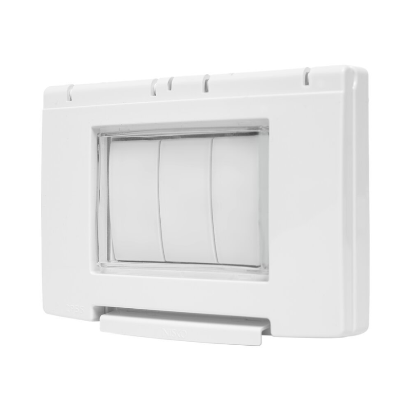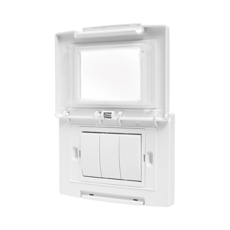 מסגרת מוגנת מים IP55 מסדרת הדגל ניסקו סוויץ. המסגרת כוללת מתאם ונפתחת לזווית של 180 מעלות לשמירה על שלמות ונוחות מירבית. ייעודית להתקנה במטבחים, בחדרי רחצה והתקנה חיצונית.