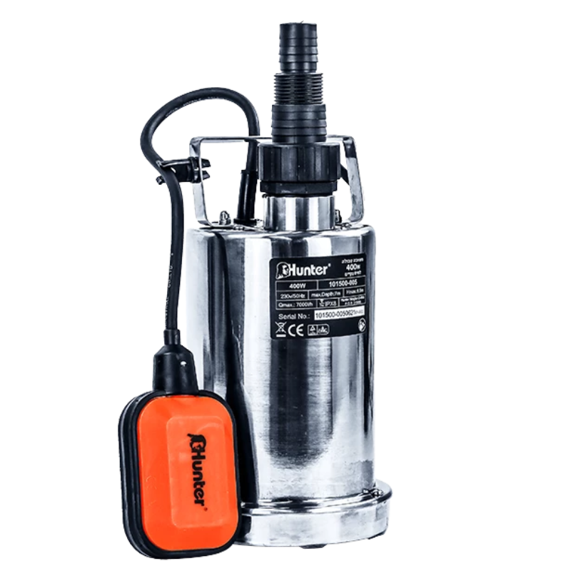 • משאבה טבולה למים נקיים מנירוסטה 400W של Hunter – כלי יעיל ואיכותי לשאיבת מים נקיים, ואידיאלי לניקוז בריכות, ריקון הצפות וכו’. מתאים לשימוש ביתי ומקצועי עבור ריקון כמעט מלא של חלל העבודה.